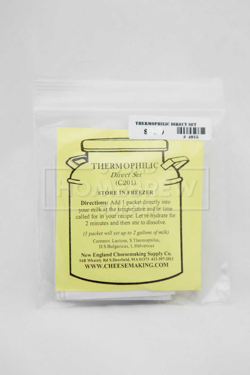 Used to make Mozzarella, Parmesan, Provolone, Romano, Swiss, Gruyere, and other Italian style cheeses, which grow in higher temperature ranges. This culture is added directly to your milk and takes all the muss and fuss out of the culturing process. CULTURE INCLUDES: lactose, (ST) streptococcus thermophilus, (LB) lactobacillus delbrueckii subsp. bulgaricus, (LH) lactobacillus helveticus. YIELD: Each packet will set 2 gallons of milk. DIRECTIONS: Add 1 packet directly into your milk at the proper temperature when the recipe calls for adding starter culture. STORAGE: Keep packages in the freezer, they will last up to 2 years.