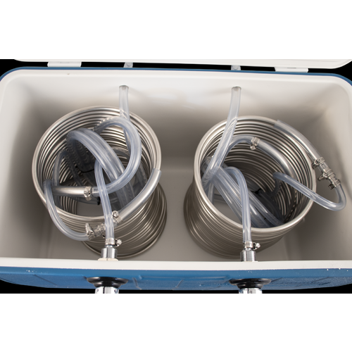 - Add ice water to the cooler, beer cools as it passes thru the super efficient plate chiller